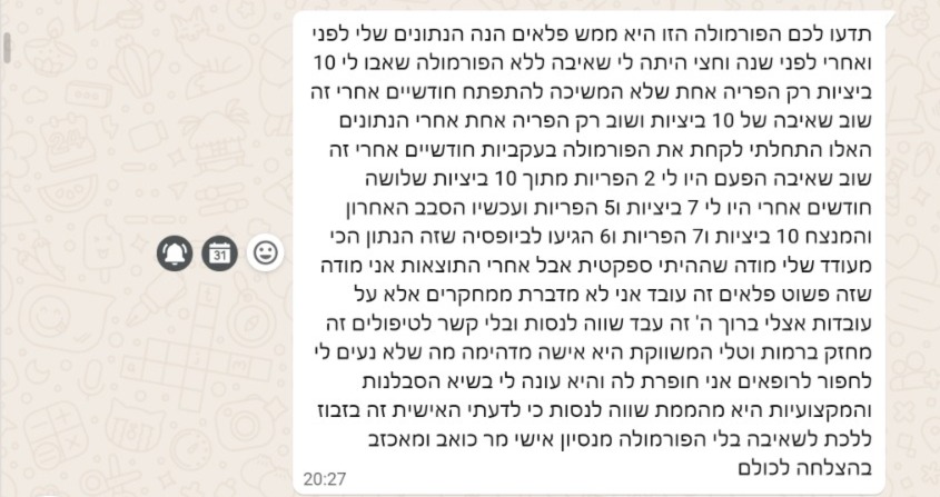 ואם את מבקשת המלצה גורפת אחת, אז לא הייתי מוותרת על התערובת הטבעית של אגוזים וזרעים של מרסל שעלולה להזין תא בודד אחד ולכן טובה אם את מנסה להיכנס להריון באופן טבעי, אם בטיפולי IVF או בשימור פוריות, בשביל להבין את הכוח של הפורמולה הזאת, צריך רק להקשיב לנשים שלקחו אותה כמו שצריך, להלן חלק מההודעות שקבלתי.